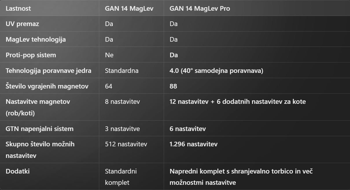 GAN 14 MagLev Pro je vrhunska izbira za vse, ki želijo največjo hitrost, natančnost in prilagodljivost. Idealna je za tekmovalce in ljubitelje hitrostnega sestavljanja, ki želijo najboljšo možno izkušnjo!